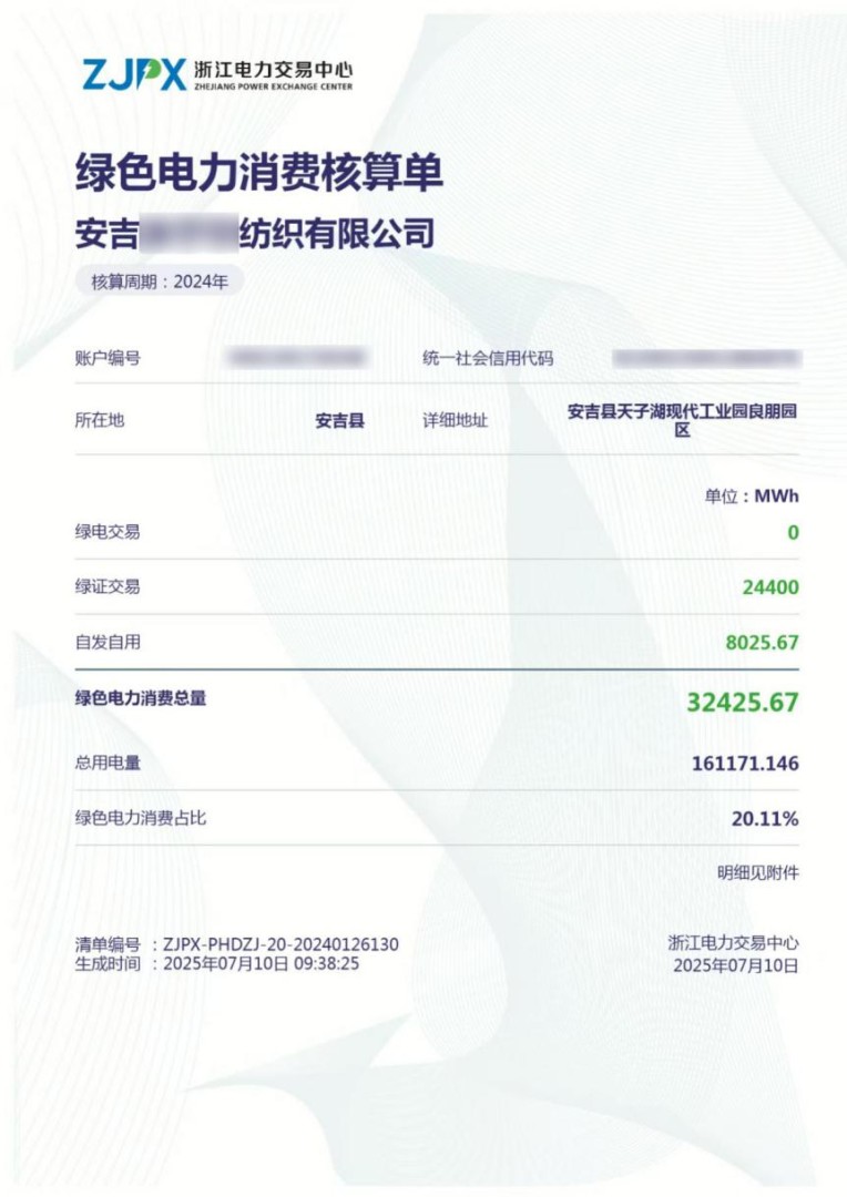 "Global carbon emission controls are now stringent, with the Carbon Border Adjustment Mechanism (CBAM) set to take effect. This green power consumption verification list has been a timely boost for our company's low-carbon development," said Yongning' er Textile Co., Ltd. in Anji County, Zhejiang Province. On October 24, the company received the green power consumption certification from State Grid Zhejiang Electric Power Company, securing its "green passport" to expand globally.